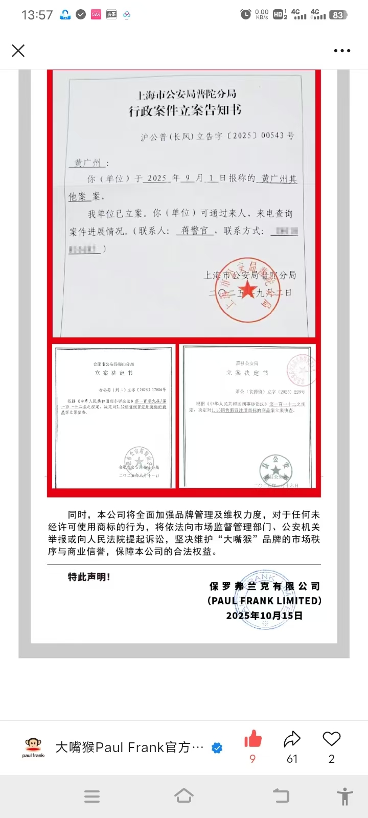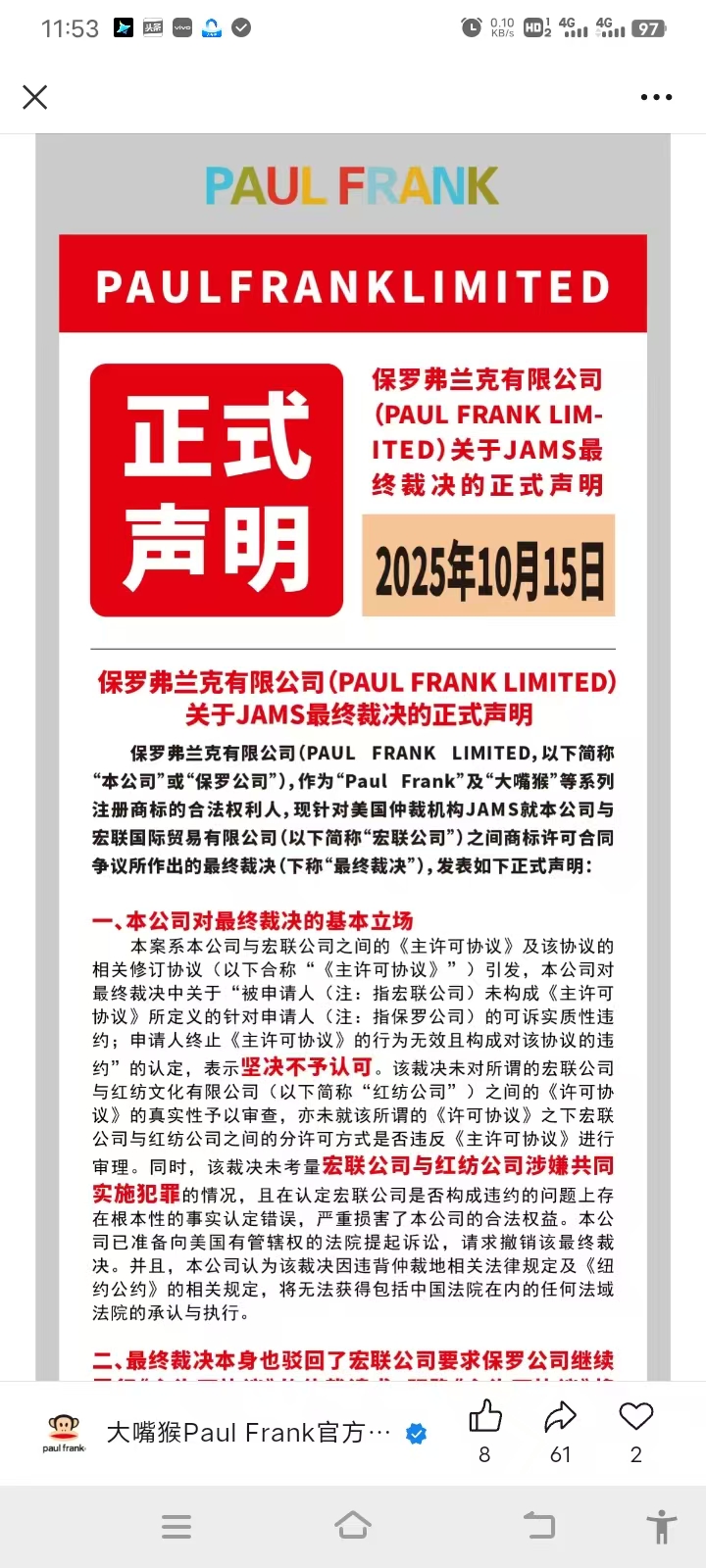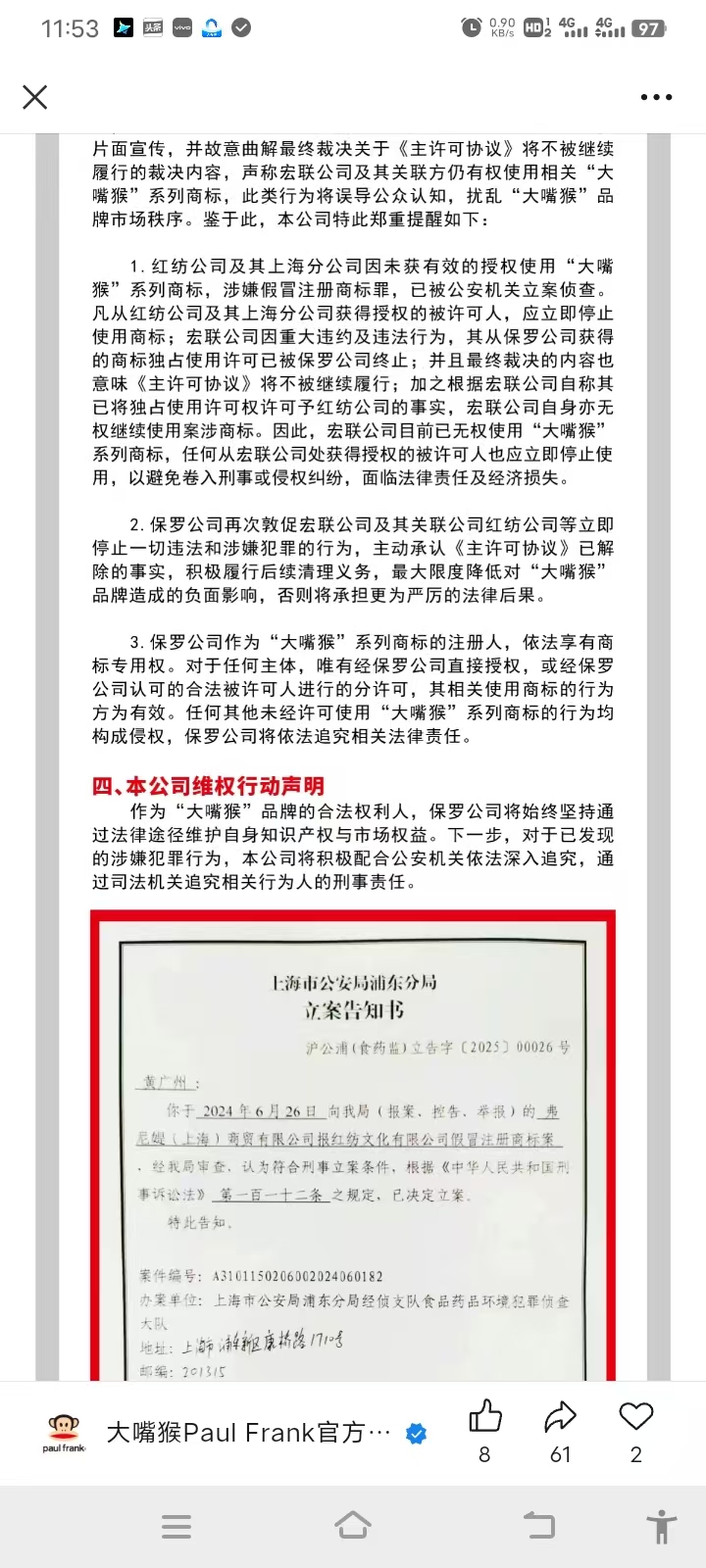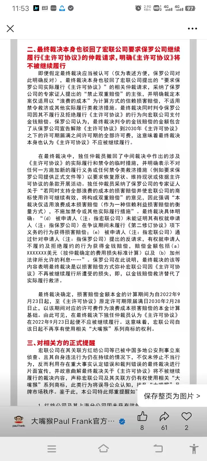 10月15日,美国保罗弗兰克公司在公众号行又发起一篇文章,否认美国仲裁争议,并威胁大嘴猴中国加盟商,未经过起批准,所有使用其商标公司均为违法,所有大嘴猴加盟商均成为受害者。而中国宏联国际月奋起反击,严厉指责美国弗兰克公司违法,广大观众敬请吃瓜。